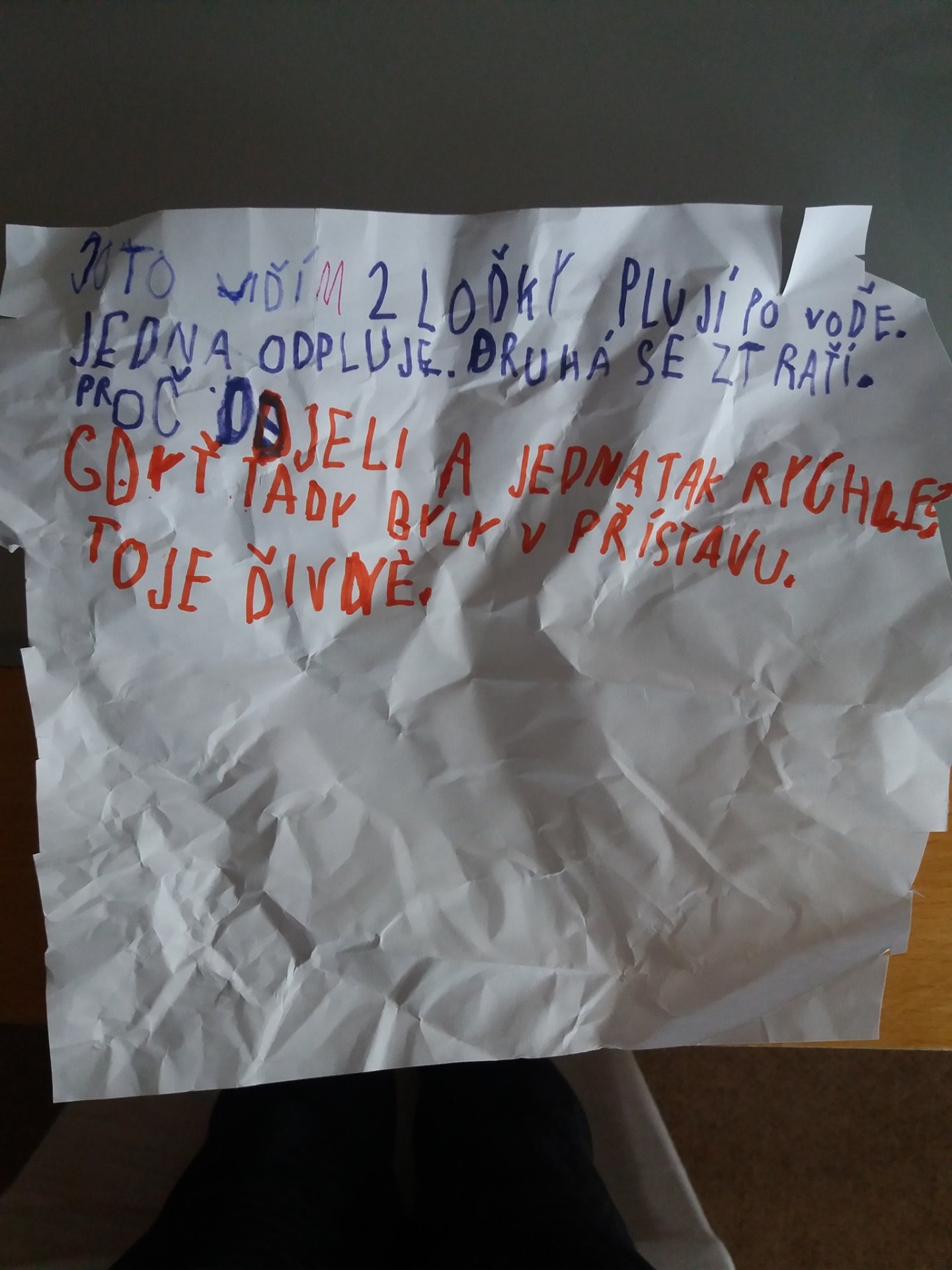 Co to vidím? 2 loďky plují po vodě. Jedna odpluje. Druhá se ztratí. Proč odjely a jedna tak rychle? Vždyť tady byly v přístavu. To je divné.